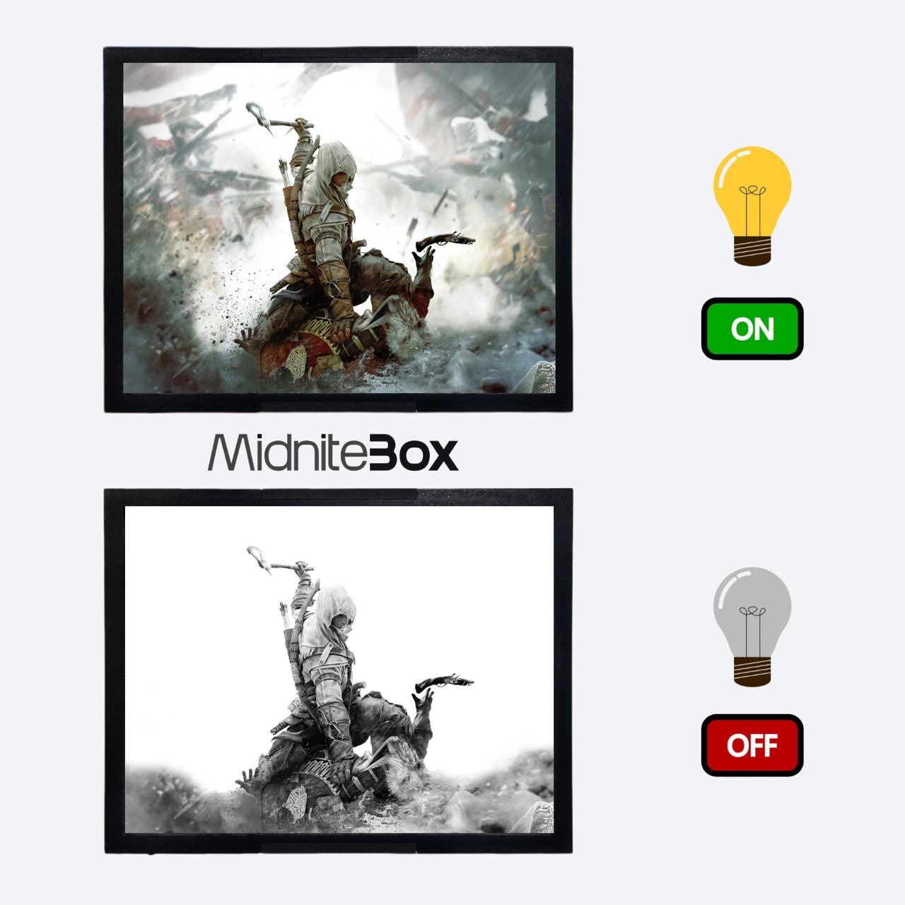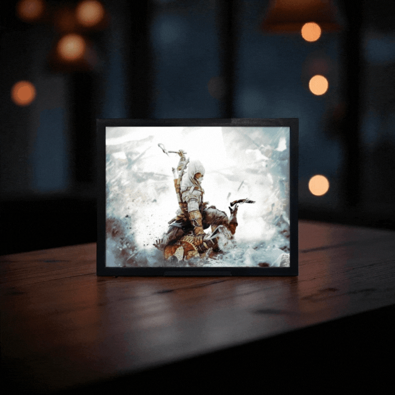 Işık kapalıyken sade bir siluet olarak görünen tasarım, ışık açıldığında etrafındaki savaş sahnesi, duman ve hareket hissiyle detaylı bir atmosfere dönüşür. Güçlü, kararlı ve unutulmaz bir Assassin’s Creed sahnesi.