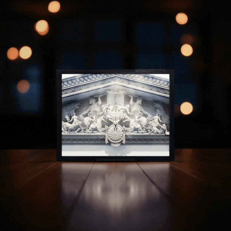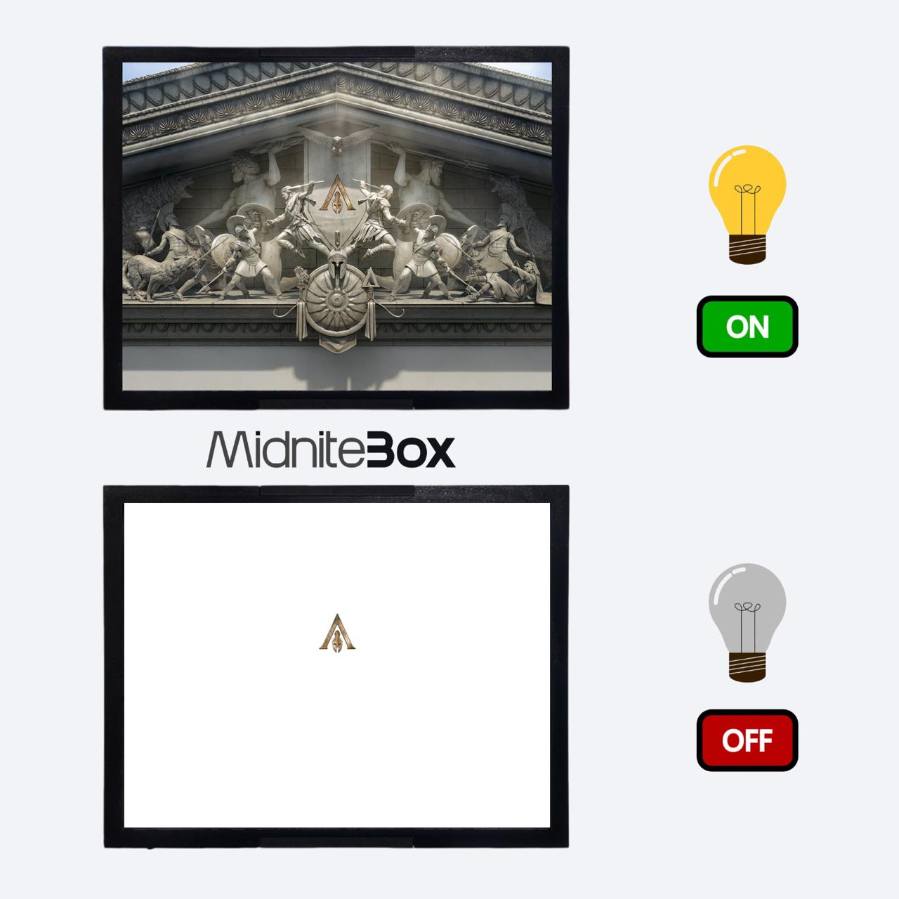 Işık kapalıyken sade bir Assassin’s Creed logosu görünürken, ışık açıldığında arka plandaki tapınak kabartmaları ve savaşçı figürleri detaylı bir sahneye dönüşüyor. Mitolojik dokular ve taş işçiliğiyle bezeli bu tasarım, koleksiyonunuzun en şık parçalarından biri olacak.