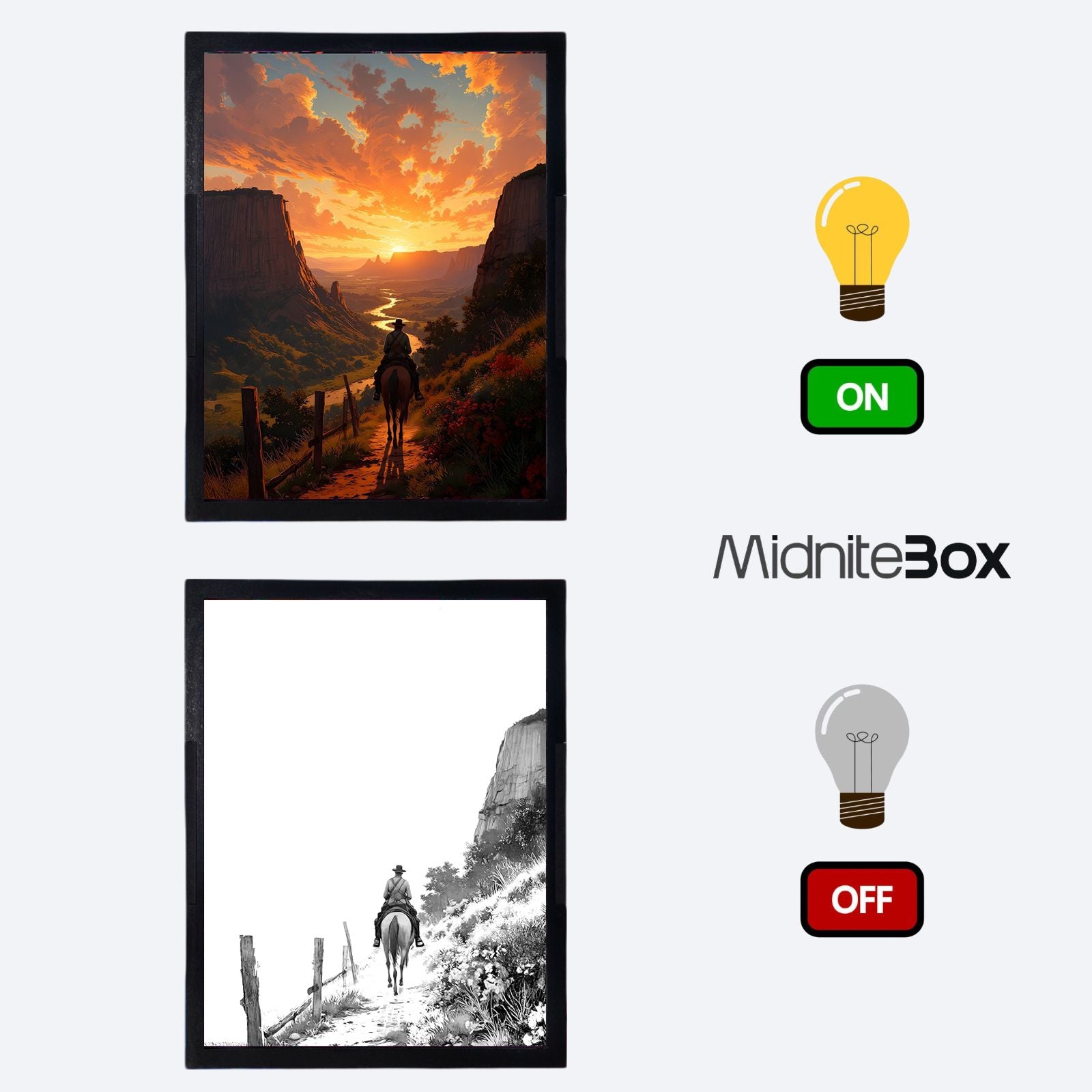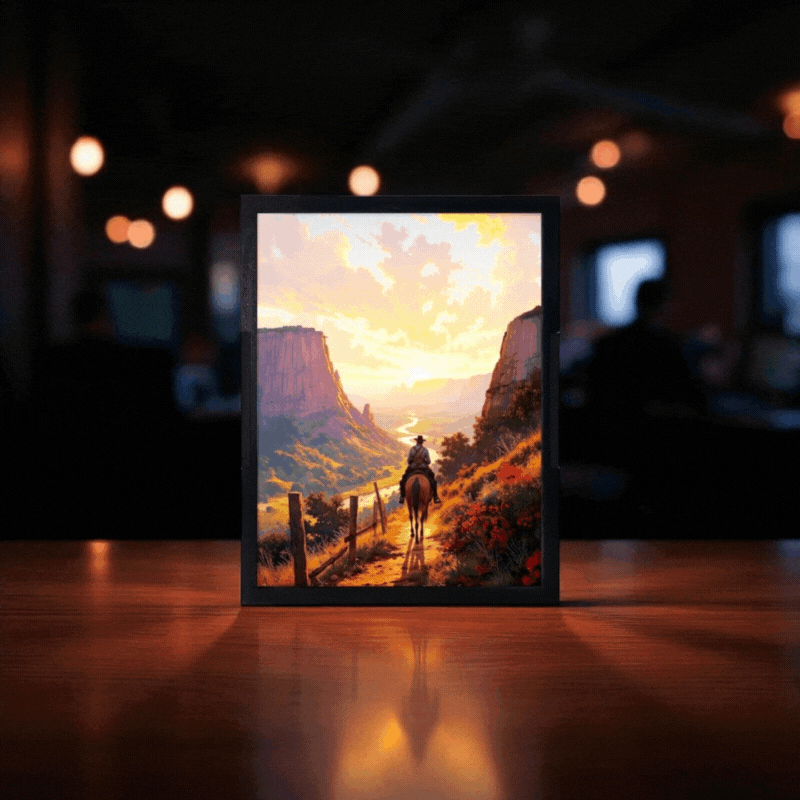 Işık kapalıyken çizgi formda sakin bir yol sahnesi görünürken, ışık açıldığında kanyonlar arasında ilerleyen bir kovboy, yanan gökyüzü ve derin manzarayla duygusal bir yolculuğa dönüşür. Red Dead Redemption evreninin ruhunu taşıyan bu özel parça, dekoratif olduğu kadar anlam yüklü bir deneyim sunar.