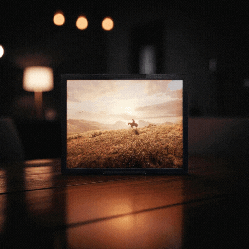 Işık kapalıyken yalnızca bir siluet gibi görünen tasarım, ışık açıldığında gün batımının sıcak tonları ve doğayla bütünleşmiş kovboy figürüyle duygusal bir yolculuğa dönüşüyor.