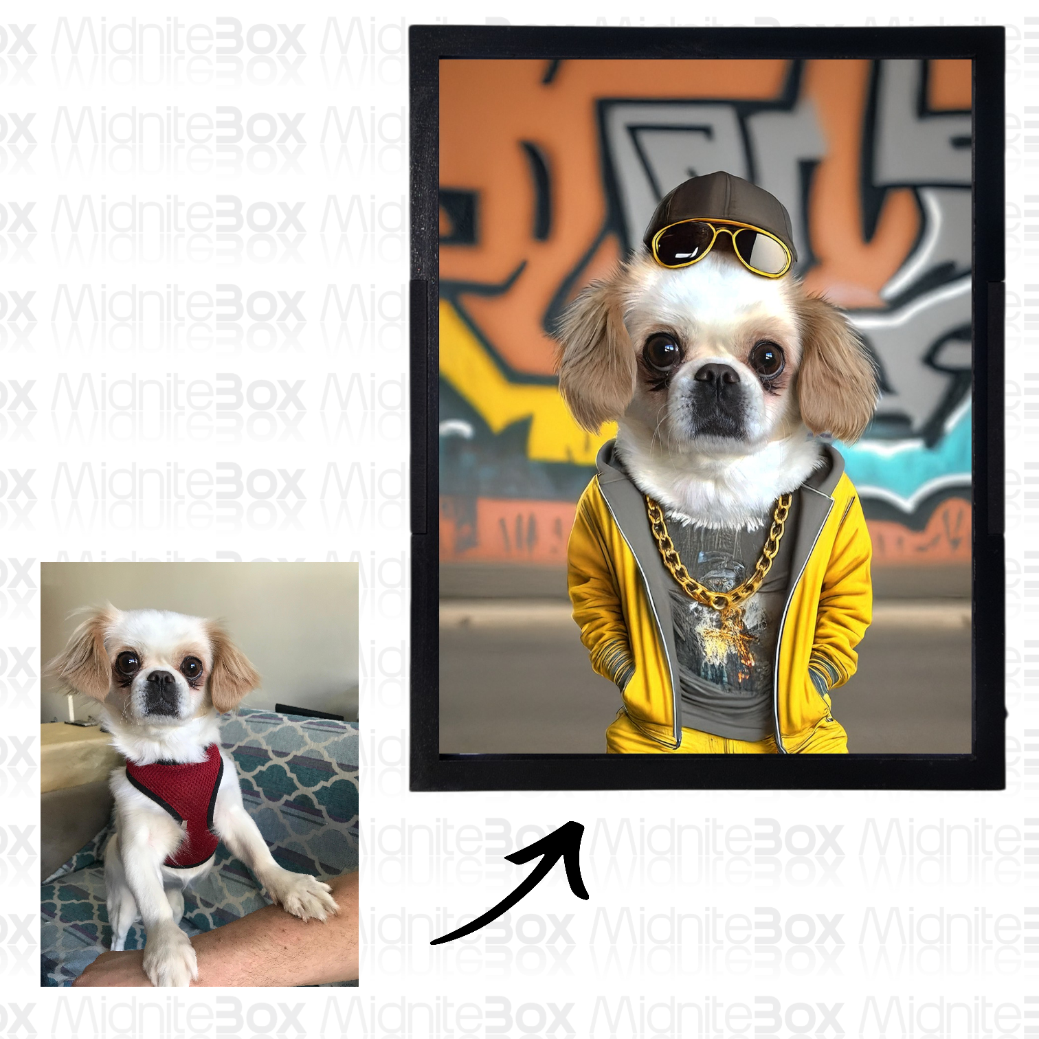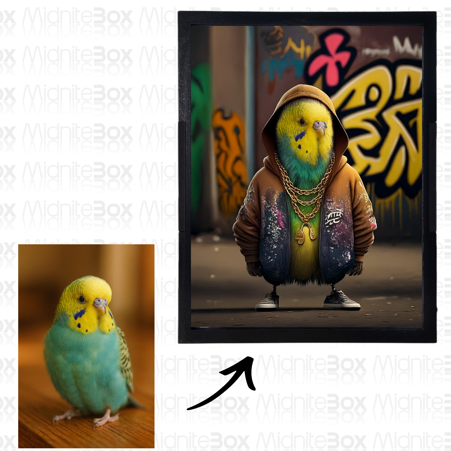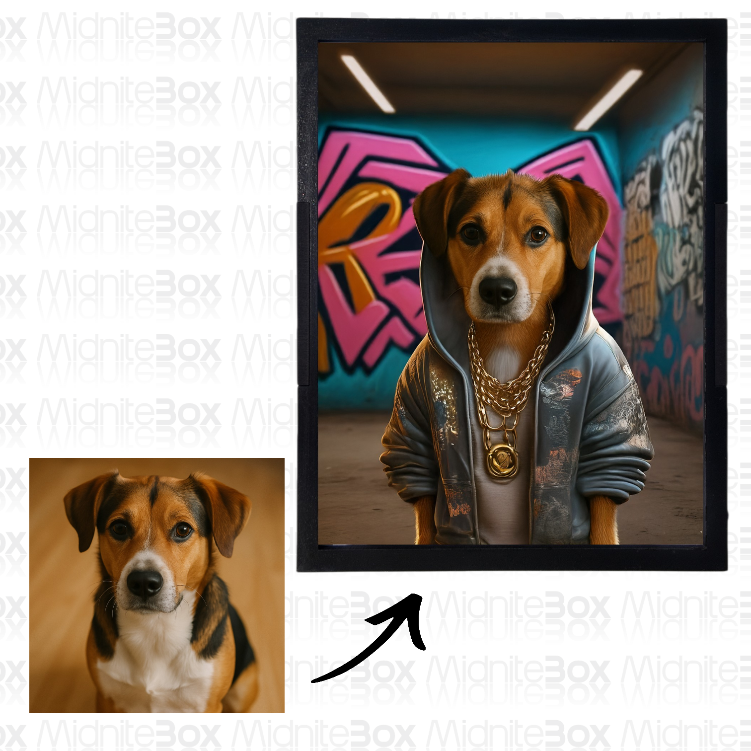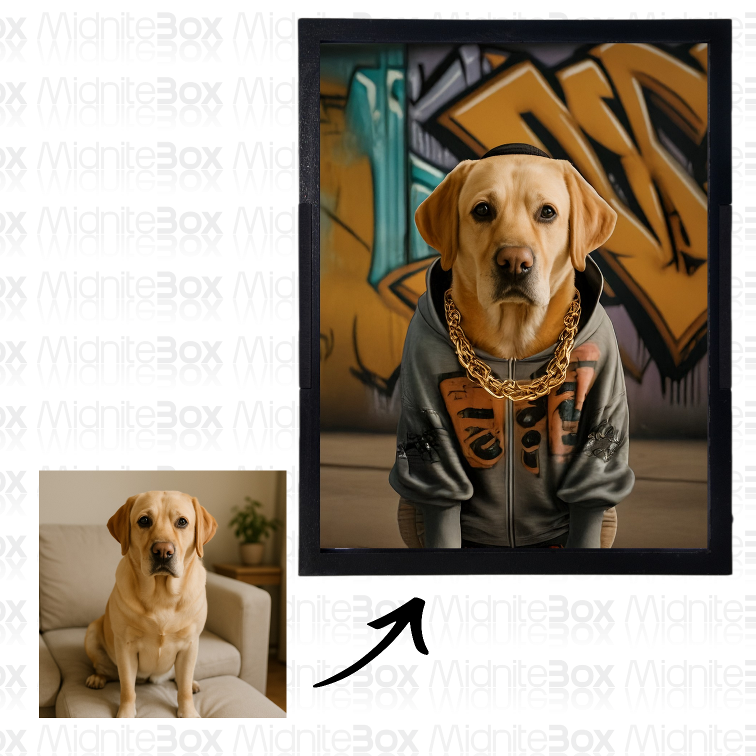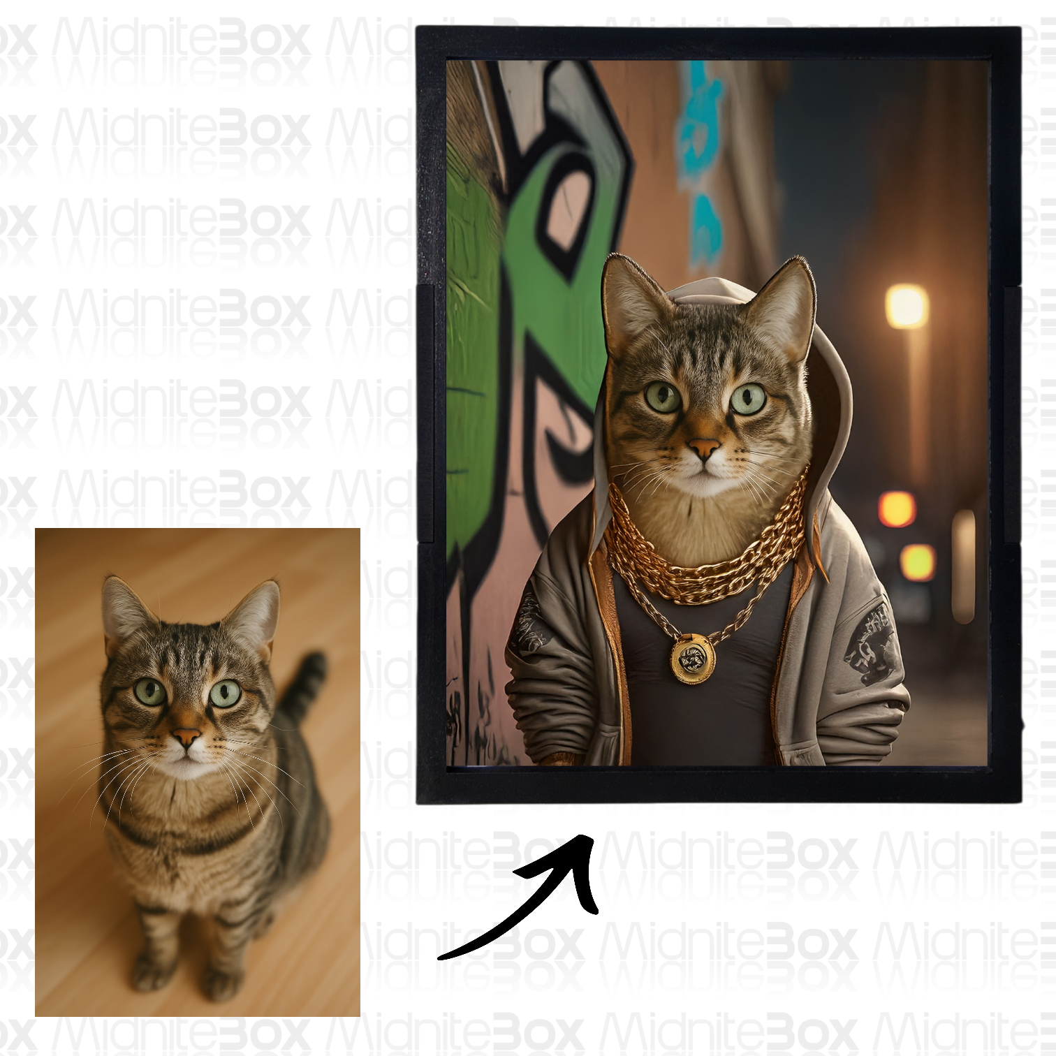 MidniteBox’ın özel ışık geçişli baskı teknolojisiyle, evcil hayvanınızın fotoğrafı özel tasarım bir gece lambasına dönüşüyor. Bu seride ışık açıkken de kapalıyken de aynı karizmatik portre görünür — ister kedi, köpek, kuş ya da başka bir dostunuz olsun, hoodie, altın zincir ve grafiti fonuyla ona bambaşka bir hava katın.