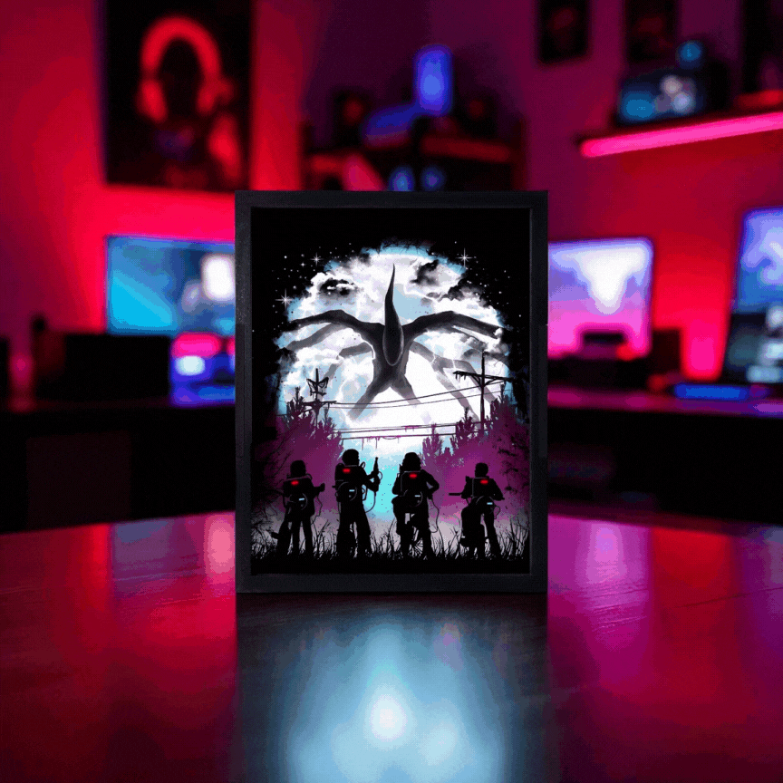 Stranger Things’in unutulmaz atmosferini taşıyan bu tasarımda, dört arkadaş gece gökyüzüne bakarken büyük bir bilinmezlikle yüzleşiyor. Işık kapalıyken yalnızca huzurlu bir gece sahnesi görünürken, ışık açıldığında gökyüzünde beliren dev yaratık karanlıkla yüzleşmenin tam ortasına seni çekiyor. Neon detaylar ve siluet geçişleriyle öne çıkan güçlü bir sahne.