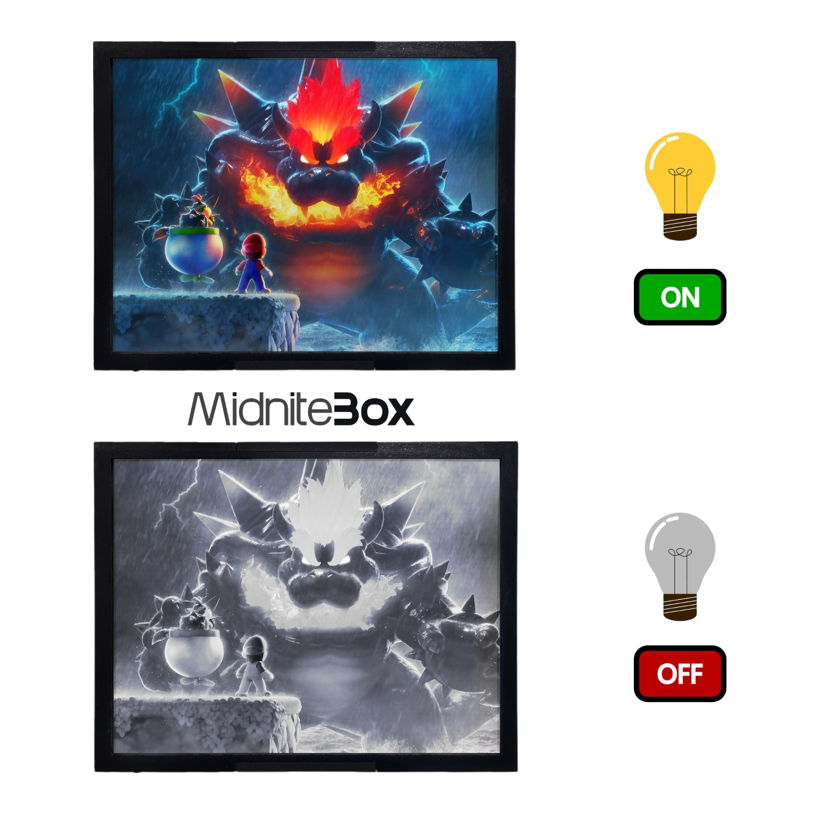 Super Mario’nun en güçlü düşmanı Bowser, bu kez devasa ve ateş saçan haliyle MidniteBox sahnesinde! Işık kapalıyken dramatik bir çizgi roman etkisi sunan bu tasarım, ışık açıldığında renkli, korkutucu ve büyüleyici bir görsele dönüşüyor.
