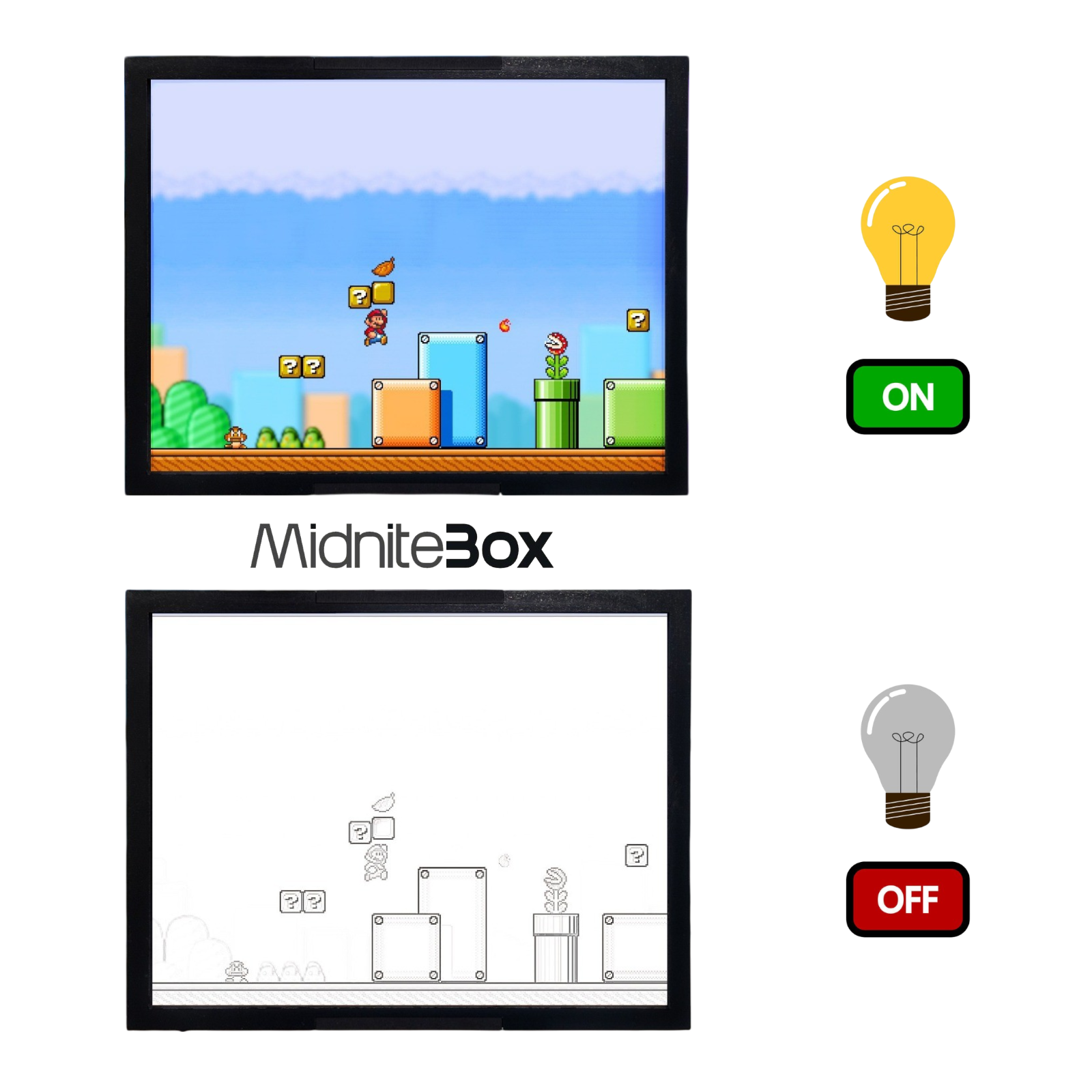 Bu özel tasarım MidniteBox, klasik bir Mario sahnesini hem nostaljik hem de yenilikçi bir şekilde yansıtıyor. Işık kapalıyken sade ve çizgisel bir Mario evreni seni karşılar; ışığı açtığında ise sahne adeta canlanır ve renkli bir oyun dünyası ortaya çıkar!